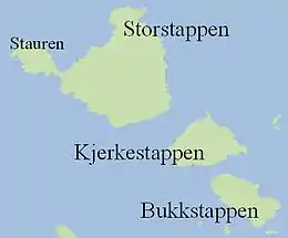 Storstappan rises to a height of 283 metres (928 ft) above sea level and has a peninsula called Stauren that rises to 165 metres (541 ft). Kjerkestappen rises to an elevation of 166 metres (545 ft) above sea level and Bukkstappen rises to 92 metres (302 ft) above sea level. Historically, there were people that lived on the islands and there was a church on Kjerkestappen.
