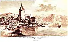 Few elements of the mediaeval fortress survive. A 1784 engraving by Jean-Benjamin de La Borde shows a building with a tall quadrangular central tower capped by a pyramidal roof. There is a legend that the tower was demolished in the 19th century because it was casting shade over the vineyard. Although that story does lend support to the idea of a long-standing close connection between castle and vineyard, it is untrue. The tower was halved in height because vibration from the newly built Simplon railway threatened to bring the whole structure down.[2]