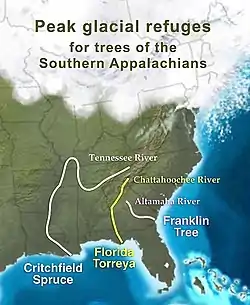 In eastern North America, lowland glacial refugia along the Atlantic and Gulf Coasts host endemic plants — some of which are rare, even endangered, and others entail the most southerly disjunct populations of plants that commonly appear only hundreds of miles to the north. Major rivers draining southward from the Appalachian Mountains are associated with a gradation of paleoendemic tree species. These range from the extinct Critchfield spruce near the outlet of the Mississippi River, to extinct-in-the-wild Franklinia along the Altamaha River, to the critically endangered Florida torreya and Florida yew at the downstream end of the Chattahoochee River system.[11][16] (See illustration at right.)