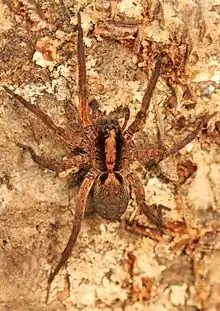 This spider is nocturnal and hides during the day.[3] It makes no web or shelter of any kind and hides under leaves in the day.[3] The female carries its eggs in a spherical sac until they hatch, after which the spiderlings may ride on the female until able to fend for themselves.[3]