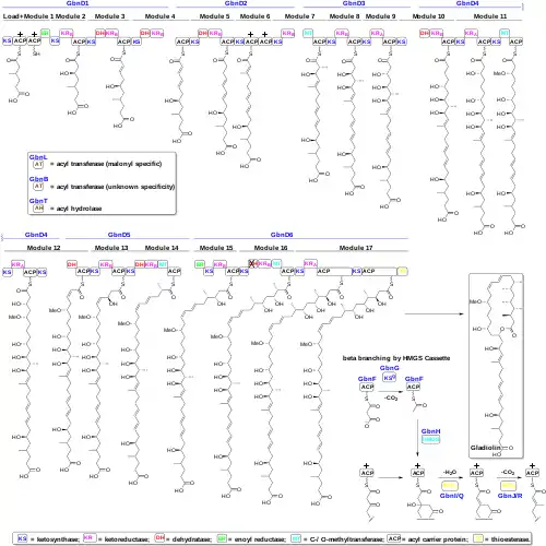 Gladiolin is assembled by trans-acyltransferase polyketide synthase (PKS). The gladiolin PKS contains 20 KS domains, 17 of which are predicted to catalyze chain elongation, the rest of them act as transacylases. The initiation step was proposed to be transacylation of the succinyl moiety of succinyl-CoA onto the active site Cys residue in the N-terminal ketosynthase domain of GbnD1 and was supported by phylogenetic analyses.[1]