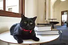 Gladstone has a social media presence on an official Instagram page, and has been reported on by media outlets as far away as Northern Ireland.[13] A parody account @TreasuryMog, also exists on Twitter.[14][15] He often receives trinkets such as cat toys, Christmas baubles from Brazil,[16] a personalised collar, and a Halloween handmade knitted scarf from Australia.[17] He appeared on the Treasury's official YouTube site, in 'Where's Gladstone Gone?', for 2016's Open House London,[18] which also appeared on Sky News. In March 2017, Gladstone was featured in the London Time Out magazine's 'Pet Power List: definitive guide to the political animals of Westminster'.[19]