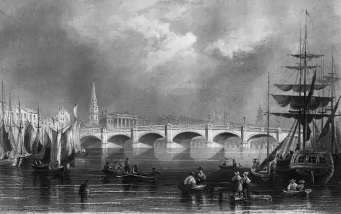 The original bridge was completed in 1772, and was designed by William Mylne and built by civil engineer John Smeaton.[1] Its seven-arch structure was honoured by Thomas Telford, the first president of the Institution of Civil Engineers, who replaced it in 1833[2] with a design built by John Gibb & Son for £34,000. One of Telford's colleagues, Charles Atherton,[3] was the resident engineer for the Works.[2] It became the first in Glasgow to be lit by electricity.[4] Between 1895 and 1899 it was replaced with the current wider bridge which incorporated Telford's stonework and expanded the arches to accommodate larger ships.[5] The present structure is protected as a category B listed building.[6]