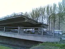 Some loose ends were left behind because of the abandonment. Amongst the most infamous examples are the access to the unbuilt south section at Tradeston which was left as a "ski-jump" (the road abruptly terminates in mid-air, and has remained so despite the 2010 M74 extension, as other plans were used to link the roads), the tangle of slip-roads at Tradeston, and the two infamous "Bridges to Nowhere"; a concrete podium over the Charing Cross section that was left empty for nearly 20 years before finally acting as a base for an office building constructed in the early 1990s (this was always its intended purpose although it had the appearance of an overbridge) and a pedestrian bridge over the carriageways that terminated in mid air as a result of the incompleteness of the adjacent Anderston Centre commercial complex. Signs saying "Ring Road" were still displayed both above and on the approaches to the central section until the late 1980s. The Anderston pedestrian bridge was finally completed in 2013 when it was joined to Waterloo Street as part of a cycle route.[5]
