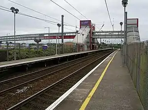 The view south at the station, showing the walkway over the A79 to the terminal building