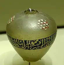 Gilding during this period involved applying small amounts of gold in suspension onto a glass body, followed by a low firing to fuse the two materials, and was adopted from Byzantine traditions.[49] This technique was often combined with enamelling, the application of ground glass with a colourant, to traditional and new vessel forms, and represents the height of Islamic glassmaking.[50] Enamelling, a resurrection of older techniques, was first practiced in the Islamic world at Raqqa (Syria) during the late 12th century, but also spread to Cairo during Mamluk rule.[44][51] A study of various enamelled vessels, including beakers and mosque lamps, suggests that there are two subtle yet distinct firing practices, possibly representing two distinct production centres or glass-working traditions.[52] Due to its high demand, enamelled glass was exported throughout the Islamic world, Europe, and China during this period.[53] Enamelling eventually ended in Syria and Egypt following disruption by various Mongol invasions from the 13th through to the 15th centuries AD.[54]