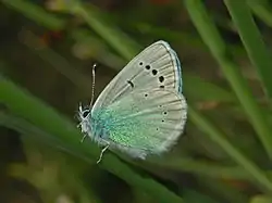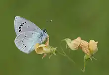 L. cyllarus Rott. (= damoetas Schiff.) (82 f). Male above light cyaneous blue with a violet sheen and narrow black border; female darker blue with the black border gradually shading off, so that it occupies nearly the whole outer half of the wings. Beneath silver-grey (male) or ashy grey (female), the forewing with 5 or 6 large rounded black spots, the hindwing with small ocelli and in its whole basal half with metallic blue-green dusting. In ab. dimus Bgstr. the ocelli of the forewing beneath are reduced to 4; on the other hand, they may also be increased in number, or may be elongate (= subtus-radiata Oberth.). In European Turkey and the neighbouring districts of Anterior Asia the ocelli of the forewing appear to be constantly or at least commonly enlarged, the blue also being darker; this is ab. tristis Gerh.. Throughout Central and Southern Europe, North Africa and North Asia to the Amur; absent from England and Japan. — ab. andereggii Ruhl (82 g) occurs in the Alps (perhaps also elsewhere); it is a large female-form which is above entirely black-brown, the underside being dark ashy grey, with the very large ocelli placed in pale rings.— blachieri Mill. (82 g) is a very small form from Southern France and the Yalais which has beneath only 4 ocelli on the forewing and very scanty blue-green dusting at the base of the hindwing; above darker and duller blue. — coelestina Mill., nec Ev. (82 g) is similar to the preceding form; above very dull in colour, underside with blue-green scaling only in the basal half, the ocelli of the forewing reduced in size , those of the hindwing almost obsolete. — lugens Car. (82 g) has altogether lost the ocellli of the hindwing; the male is darker blue above, the female being entirely black-brown almost like the female of semiargus without any blue; the blue-green scaling on the hindwing beneath is entirely absent or nearly. — aeruginosa Stgr.,[now species Glaucopsyche aeruginosa (Staudinger, 1881)]from South Russia, Asia Minor (especially the Lebanon) into Central Asia, has the hindwing beneath entirely dusted with blue-green. — laetifica Pung., [now species Glaucopsyche laetifica (Püngeler, 1898)] from the Ili R., has similar underside, but the blue of the upperside is purer and more brilliant in both sexes; the club of the antenna has a different shape (being more elongate) and is reddish yellow on the innerside, so that Pungeler regarded laetifica as being perhaps a distinct species. — Larva green or brownish, with reddish brown dorsal line accompanied by dark oblique parallel stripes which stand close together; head black. In June and the autumn on Cytisus, Genista, Astragalus, Melilotus, etc. Pupa greyish brown. North of the Alps, where occurs only one brood, the larva probably hibernates. The butterflies occur singly but are mostly common, being found on clearings in timber-woods and on wide roads, where they flutter along usually 1 to 2 m above the ground, with a slow, straight, flapping flight. They appear in the South in the spring and again from July onwards, in the North only once, at the end of May and in June.[1]