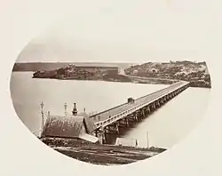 The first Glebe Island Bridge was a private toll-bridge completed in 1862 and was a timber beam viaduct with a small, one arm, hand-cranked swing-span tucked into the Pyrmont shore. After 30 years, this bridge was in need of extensive repairs and the Colonial Government purchased the structure and the Public Works Department (PWD) began planning a replacement bridge.[1] Work on the new Pyrmont Bridge and the bridge across Black Wattle Swamp shortened the travel distance to the inner west suburbs making it easier for produce to be conveyed to the city. A previously un-used part of Johnston's Bay was promoted as the site for a larger abattoir than the others previously used around the closer areas of high water. The new abattoir, to be opened in January 1860, was provided a punt system to cross the short distance to Pyrmont.[3] Work commenced on the first Glebe Island bridge in 1860;[4][5] and the first bridge opened for traffic in 1861.[6]