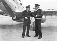 ![]() Wing Commander Cooper (left) after landing the first of No. 81 Wing's P-51 Mustangs to arrive at Iwakuni, Japan, in 1946 | |