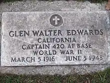 Glen Walter Edwards (March 5, 1916–June 5, 1948) was a test pilot for the United States Air Force, and is the namesake of Edwards Air Force Base.
