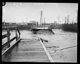 The 1910 wooden bridge shortly after it was destroyed by flooding in February of 1927.