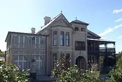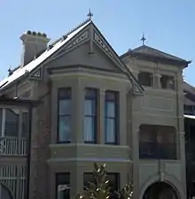 The house has a corrugated iron gabled roof with prominent chimneys, one four-flue and two three-flue, two positioned at the ridge line and one on the north end gable. The principal elevation facing Derby Street is asymmetric and has a rendered brick entry portico with a three-storey tower that rises through the first floor and above the gutter line and is finished with a low hipped roof. To the left of this is a rendered brick gabled wing with two storey bay window with central and top cornices. To the right a late Victorian two storey cast iron verandah runs around the eastern gabled wing. The verandah is supported on paired cast iron posts with a deep semicircular cast iron valance between, in a floral design, at ground floor and shallow valance above at first floor. The balustrade on the first floor is cast iron with a timber handrail. To the west is a wide Edwardian timber verandah extension which has detailing that is an interpretation of the late Victorian verandah with paired square timber posts, timber semicircular valance with slatted detail, slatted timber balustrade with central diamond pattern section at ground and first floors and shaped bracket posts at first floor. The walls beneath the verandahs are painted and unpainted brick with rendered quoins on the corners and surrounding doors, windows.[1]