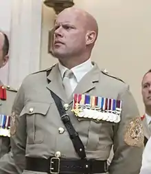 Major Glenn John Haughton, OBE (born May 1972) is a retired British Army officer. In November 2018, he served as the Senior Enlisted Advisor to the Chiefs of Staff Committee until December 2021. He was previously the Army Sergeant Major, the most senior warrant officer and member of the other ranks in the British Army, from 2015 to 2018.[1][2] He has also served as Regimental Sergeant Major of the 1st Battalion, Grenadier Guards and Academy Sergeant Major at the Royal Military Academy Sandhurst.[1][3]