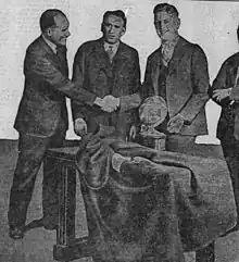 Thistlethwaite (left) shakes the hand of Tim Lowry (right) as Lowry receives the 1925 Chicago Tribune Silver Football. In between them is Athletics Director Kenneth L. Wilson