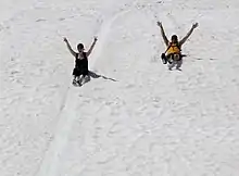 Glissading is the act of descending a steep snow- or scree-covered slope via a controlled slide on one's feet or buttocks. It is an alternative to other descent methods such as plunge stepping, and may be used to expedite a descent, or simply for the thrill. Glissading involves higher risks of injuries than other forms of descending.[1][2] Glissading with crampons is especially dangerous and should never be attempted.[1][3]