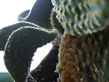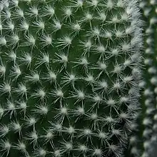 Glochids or glochidia (SG: "glochidium") are hair-like spines or short prickles, generally barbed, found on the areoles of cacti in the sub-family Opuntioideae. Cactus glochids easily detach from the plant and lodge in the skin, causing irritation upon contact. The tufts of glochids in the areoles nearly cover the stem surfaces of some cactus species, each tuft containing hundreds of glochids; this may be in addition to, or instead of, the larger, more conspicuous cactus spines, which do not readily detach and are not generally barbed.