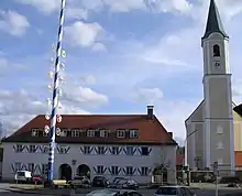After the old church was destroyed in the Thirty Years' War, a new church was begun about 1768, but finished and consecrated only in 1823. It is built in the Rococo style and contains altar figures and a crucifix with Schmerzhafte Muttergottes (“Mater Dolorosa”) by the artist Joseph Götsch (a student of Ignaz Günther). In 1994 the church was completely renovated.