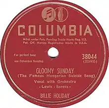 "Gloomy Sunday" was first recorded in English by Hal Kemp in 1936, with lyrics by Sam M. Lewis,[2] and was recorded the same year by Paul Robeson, with lyrics by Desmond Carter. It became well known throughout much of the English-speaking world after the release of a version by jazz and swing music singer Billie Holiday in 1941. Lewis's lyrics referred to suicide, and the record label described it as the "Hungarian Suicide Song". There is a recurring urban legend which claims that many people have committed suicide while listening to this song, particularly Hungarians.[3]