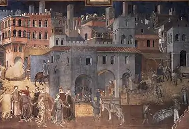 In celebration of a new fountain in Siena's main square, the Guelphs, who currently hold the city, declare a temporary truce with the exiled Ghibellines and allow them to enter Siena for the festivities on condition that they come unarmed and leave the city at sunset. A chorus of young women sings the praises of the fountain, "O! Puri marmi" (Oh! Pure marble). Lionetto de' Ricci, one of the exiles, and Gloria, the daughter of Guelph nobleman Aquilante de' Bardi, are attracted to each other when she gives him water to drink from the fountain. Gloria sings "Amore, amor! Fonte muta" (Love, love! Silent fountain). Her brother Bardo, demands to know the exile's name. Lionetto recounts the story of his family, "Storia ho di sangue" (My story is one of blood), and Aquilante realises that he the son of the nobleman who had previously surrendered Montalcino to the Ghibellines. At sunset Lionetto refuses to leave the city unless he can take Gloria with him as his bride. In the midst of angry protests from Aquilante, Bardo, and the other Guelph noblemen, Lionetto's cloak falls away, revealing not only that he is armed but is also a famous condottiere of the Ghibelline forces known as "Il Fortebrando". Lionetto's men, who had also concealed their swords, come to their captain's aid. They and Lionetto make their escape from Siena taking Gloria with them.