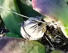 The seed capsule has a very soft, round, spongy base, and thick valves raised up in a high (>3 mm) rounded dome shape at the top. The capsule's surrounding rim is low and depressed. The stalks of the capsule disintegrate rapidly, allowing the capsule itself to fall. The rounded capsule then rolls and spreads the seed further (tumble fruit).