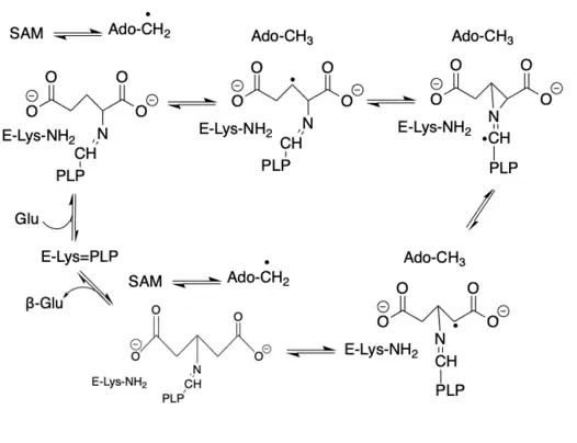 - 1 2 3 Ruzicka FJ, Frey PA (February 2007). "Glutamate 2,3-aminomutase: a new member of the radical SAM superfamily of enzymes". Biochimica et Biophysica Acta (BBA) - Proteins and Proteomics. 1774 (2): 286–96. doi:10.1016/j.bbapap.2006.11.008. PMC 1945111. PMID 17222594.