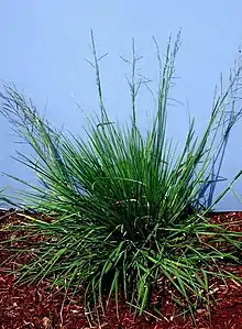 This rhizomatous perennial grass produces narrow stems approaching a maximum height of 1.5 meters. The leaves may be flat or rolled along the edges and they have ligules up to a centimeter long. The inflorescence is narrow and compact, bearing spikelets parallel to the stem instead of spreading outward. Each spikelet is one to two centimeters long and contains up to 14 or 15 florets with membranous margins.