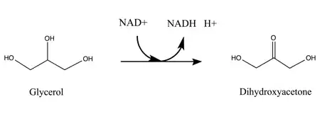 Encoded by the gene gldA, the enzyme glycerol dehydrogenase, GlyDH catalyzes the oxidation of glycerol to glycerone. Unlike more common pathways utilizing glycerol, GlyDH effectively oxidizes glycerol in anaerobic metabolic pathways under ATP-independent conditions (a useful mechanism in the breakdown of glycerol in bacteria). In addition, GlyDH selectively oxidizes the C2 hydroxyl group to form a ketone rather than a terminal hydroxyl group to form an aldehyde.[10]