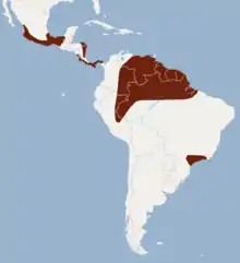 It is found in Bolivia, Brazil, Colombia, Costa Rica, French Guiana, Guyana, Honduras, Mexico, Nicaragua, Panama, Peru, Suriname, Trinidad and Tobago, and Venezuela. It is generally found at elevations lower than 800 m (2,600 ft) above sea level, but has been documented up to 1,100 m (3,600 ft).[1]