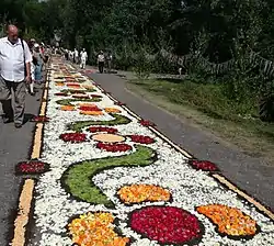 Flower carpets along Corpus Christi procession route in Spycimierz
