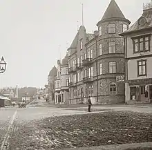Street in Gnesta with bathhouse, c. 1900