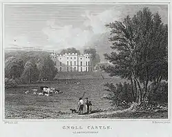 Through the widow of Sir Herbert's brother Robert Mackworth (died 1795), the estate passed to Capel Hanbury Leigh, Lord Lieutenant of Monmouthshire, and it was later bought by Henry Grant of Pembrokeshire and Wormley, Hertfordshire (died 1831)[4] Shortly before his son Henry John Grant's death in 1861, there was a plan in 1857 to use the castle as a university college and some staff including the gamekeeper moved to Wormley, but instead it was purchased by a cousin Charles Evan-Thomas of Llwynmadoc,[2] who demolished the east wing and added other architectural features. He was the father of Admiral Hugh Evan-Thomas, who was born at the Gnoll.[5] A year after Sir Hugh's death, the Gnoll was bought by Neath corporation[6] as a site for a war memorial.[7] The castle was demolished in 1957.[8]