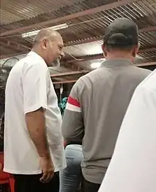 Gobind Singh standing and smiling at guests at the 2023 Selangor state election Dusun Tua DAP fundraising dinner in Kajang, Selangor on 3 June 2023.