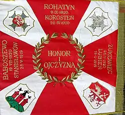 The phrase "Honour and Fatherland" can be traced to the slogans and banners of Polish revolutionaries of the 19th century, fighting to regain Polish independence following the partitions of Poland.[2] This is also the motto of the French Legion of Honour, instituted by Napoleon in 1802.[3] It is likely that the phrase was brought to Poland by the soldiers of the Napoleonic-era Polish legions.[2][4][5] It was introduced as phrase to be used on the banners of the newly reconstituted Polish military of the Second Polish Republic in 1919.[6] The word God was officially added to the standards, preceding words Honour and Fatherland, by the decree of the Polish government-in-exile in 1943.[7] This decree remained in force till it was changed by the communist government of the People's Republic of Poland in 1955 to "For Our Fatherland the People's Republic of Poland" ("Za naszą Ojczyznę Polską Rzeczpospolitą Ludową").[8] Following the fall of communism, the "God, Honour, Fatherland" phrase was restored by the government of the Third Polish Republic in 1993.[9] Since 2018, the phrase appears on the Polish passport.