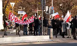 "Bóg, Honor, Ojczyzna" motto on a banner carried by participants of the Polish Day of Independence celebrations in 2011.