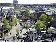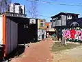 The decommissioned railway lines leading up to the former freight station, has been unused for many years, but along with the construction of the Godsbanen cultural centre, independent cultural actors were allowed by the municipality to move in. This led to the do-it-yourself village of Institut for (X), a recycling station, and other time limited cultural and social projects sprouting in the area since 2009. The deal is that while no rent is paid, settlements and activities should give way for future construction projects in the area. Along with the new Godsbanen cultural centre, this whole area was unofficially dubbed Aarhus K ("K" for Kultur or Culture in Danish) as a kind of new cultural district for the city.[9][10]
