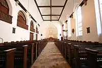 The interior has white-washed walls and a barrel-vaulted ceiling with exposed timber structure. A series of round-arched windows on the west side provides natural light and the choir, raised three steps from the nave, is top lit. There is a gallery above the entrance in the north wall.