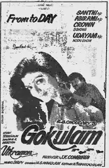 Gokulam is a 1993 Indian Tamil-language romantic drama film directed by Vikraman. The film stars Jayaram (in his major Tamil debut) and Bhanupriya, with Arjun Sarja in a supporting role. It was released on 11 June 1993.[1][2]