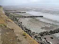 The south of the village is bounded by the foreshore of the Severn Estuary, which lies behind a tall concrete-faced sea wall, allowing for aboiteau-type cultivation. A number of groynes can be seen at low tide.