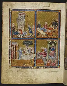The Golden Haggadah is an illuminated Hebrew manuscript originating around c. 1320–1330 in Catalonia. It is an example of an Illustrated Haggadah, a religious text for Jewish Passover. It contains many lavish illustrations in the High Gothic style with Italianate influence, and is perhaps one of the most distinguished illustrated manuscripts created in Spain. The Golden Haggadah is now in the British Library and can be fully viewed as part of their Digitized Manuscript Collection MS 27210.[1]