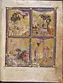 The original illustrators for the manuscript are unknown. Based on artistic evidence, the standing theory is that there were at least two illustrators.[2] While there is no evidence of different workshops producing the manuscript, there are two distinct artistic styles used respectively in groupings of eight folios on single sides of the pages. The first noticeable style is an artist who created somewhat standardized faces for their figures, but was graceful in their work and balanced with their color. The second style seen was very coarse and energetic in comparison.[2]