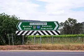 Golden Highway provides a fairly low altitude crossing of the Great Dividing Range.[4] It runs through the Hunter Region[5] and gives access to the golden west of New South Wales.[6]
