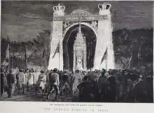 As the fiftieth anniversary of Victoria's accession approached, public anticipation of national celebrations began to grow, encouraged by the Liberal politician, Lord Granville. At the previous royal jubilee, the Golden Jubilee of George III, the king had been ill at Windsor Castle, so there was little precedent to follow.[2] In 1872, the recovery of Edward, Prince of Wales from a bout of typhoid fever was marked by Victoria processing through London to a thanksgiving service at St Paul's Cathedral; despite the queen's reluctance, this had proved to be a resounding success which had silenced the many critics of the monarchy.[3] For the Golden Jubilee, Victoria had informed the Conservative prime minister, Lord Salisbury, that she intended to have a thanksgiving service at Westminster Abbey, and ignoring the Biblical tradition that the start of the fiftieth year should be celebrated, the jubilee should mark the completion of fifty years. The service should reference Victoria's coronation, although the queen would not wear a crown or robes of state. This entailed considerable alterations inside the Abbey, which Lord Salisbury reluctantly agreed to finance, but he insisted that the queen should underwrite the rest of the costs.[4]