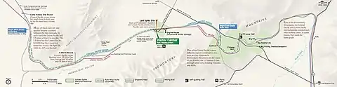 The Golden Spike National Historical Park encompasses 2,735 acres (1,107 ha). Initially just 7 acres (2.8 ha) when it was established in 1957, limited to the area near the junction of the two rail systems, the site was expanded by 2,176 acres (881 ha) in 1965 through land swaps and acquisition of approximately a strip of land mostly 400 feet (120 m) wide along 15+1⁄2 miles (24.9 km) of the former railroad right-of-way. It reached its present size in 1980.[6][7] In addition to the Summit site where the rails were joined, the Park includes the two linear areas known as the west slope (west of the junction) and the east slope (east of the junction), which include worker campsites, partially-completed grades, incomplete cuts, specialty workshops, and two historical landmarks: where the Central Pacific finished its "Ten miles of track, laid in one day" tracklaying record (west slope) and where the Big Fill and Big Trestle were completed (east slope).[8]