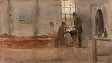 Conder's 9 by 5 work Impressionists' Camp (1889, National Gallery of Australia) shows Streeton and Roberts inside the Eaglemont homestead. Streeton's Impression for Golden Summer hangs on the wall.