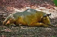 The golden takin (Budorcas taxicolor bedfordi) is a threatened subspecies of takin, native to the Qin Mountains in the south of China's Shaanxi province.[1] There are four distinct subspecies of the Takin: Mishmi Takin (B. t. taxicolor), Sichuan Takin (B. t. tibetana), Bhutan Takin/White's Takin (B. t. whitei), and Golden takin (B. t. bedfordi).[2]