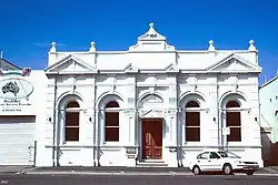 The main facade, facing north-west towards the Fitzroy River, has a central entry and two arch-headed windows to either side. The facade is articulated with pilasters and triangular pediments and has a parapet with ball finials above.[1]
