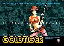 Goldtiger (subtitled Goldtiger: The Poseidon Complex) is a British graphic novel, first published by Rebellion Developments in 2016, and promoted in conjunction with the company's 2000 AD comic. The book tells the history of short-lived and controversial spy-themed newspaper comic strip "Goldtiger" by acclaimed Italian artist Antonio Barreti and science fiction novelist Louis Schaeffer, interspersed with the strips themselves. It was the first comic to bear the 2000 AD branding without having appeared in the comic previously.