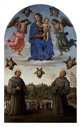 It was commissioned as a gonfalon (banner for public processions) by the brothers of the Confraternity of Justice in Perugia. It dates to the artist's peak, just after the success of his cycle of paintings for the Sala delle Udienze del Collegio del Cambio, when he was working in both Florence and Perugia. It shows the Madonna and Child accompanied by angels and seraphim, with Francis of Assisi (with the stigmata) and Bernardino of Siena kneeling below them.