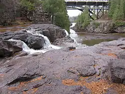 The most distinctive features of Gooseberry River are the Gooseberry Falls, three waterfalls in close succession near Highway 61 in Gooseberry Falls State Park. They begin .95 miles from the mouth of the river 120 feet above lake level, and end .75 miles from the mouth at 7 feet above lake level.[13] Another fall is located between 1.8 and 1.85 miles from the mouth.[13] The bed of the river near the falls is a basalt flow lying over an Amygdaloid flow. The Amygadloids erode faster than basalt, which then breaks off in large pieces, causing the high cliffs over which the river flows.[14] Below the falls, the river cuts a large channel through mostly clay.[14] To the northeast, a large basalt[14] cliff rises 75 feet above lake level.[15] To the southwest of the mouth is a lower cliff of only 10 feet, which was probably once attached to the high bluff before the river cut a channel between them.[15] At the mouth, the flow of the river meets the opposing force of storms on the lake, kicking up a bar of red pebbles and chalcedony agates.[15]