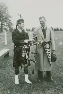 ![]() MacDonald (right) with a college bagpiper in 1936 | |